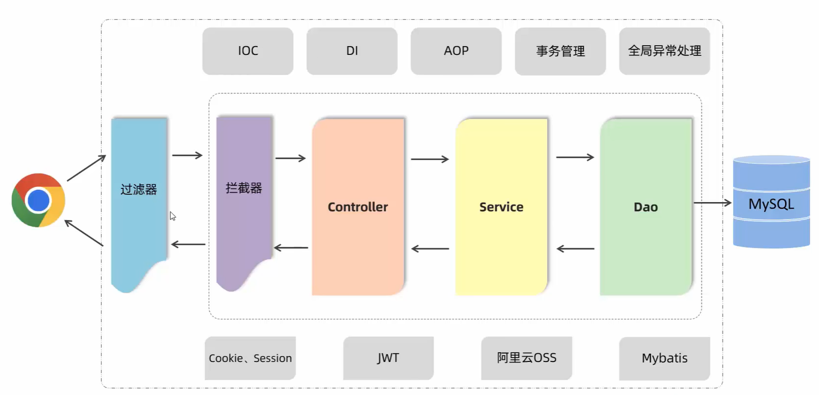 异步交互:可以在不重新加载整个页面的情况下,与服务器交换数据并更新部分页面的技术。如搜索联想功能