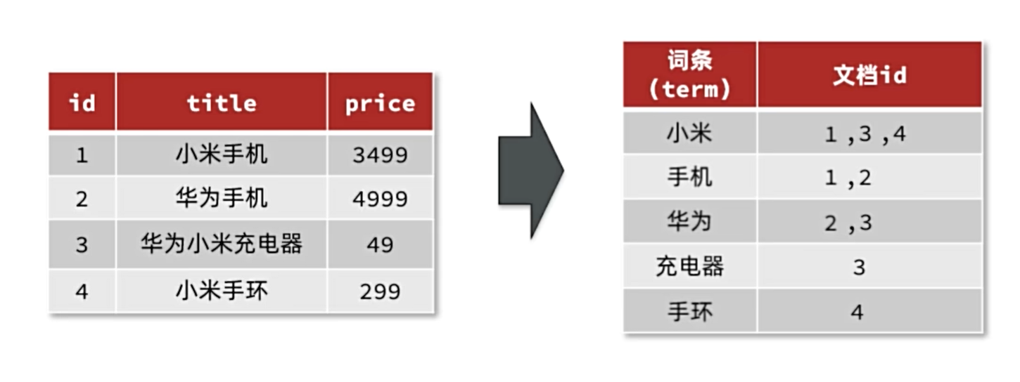 - 而倒排索引则相反,是先找到用户要搜索的词条,根据词条得到保护词条的文档的id,然后根据id获取文档。是根据词条找文档的过程。