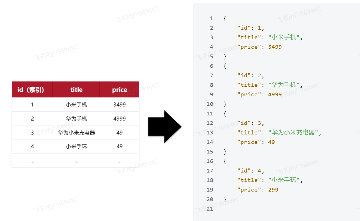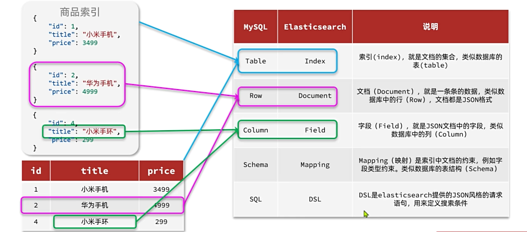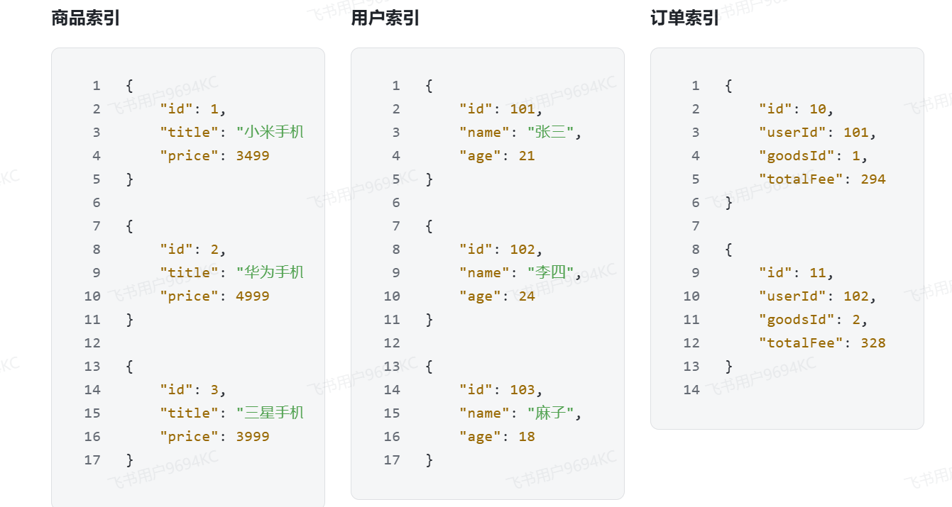 - 文档(Document):用来搜索的数据,其中的每一条数据就是一个文档。例如一个网页、一个商品信息