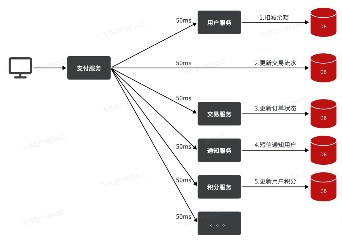 - 级联失败(雪崩问题):当交易服务、通知服务出现故障时,整个事务都会回滚,交易失败。