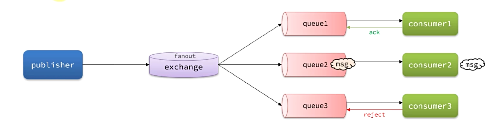 - reject:消息处理失败并拒绝该消息,RabbitMQ从队列中删除该消息