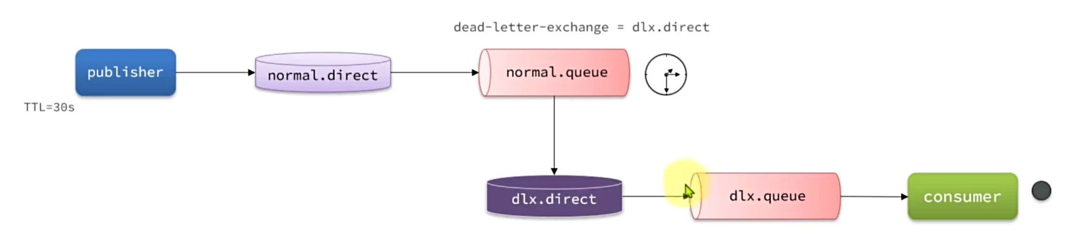 - 利用 TTL 让消息在普通队列中延迟一段时间。