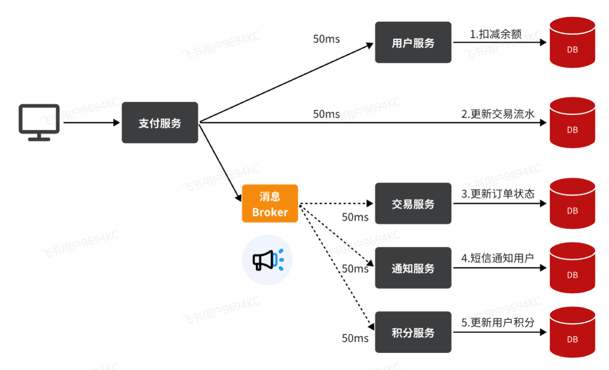 在异步调用中,发送者不再直接同步调用接收者的业务接口,而是发送一条消息投递给消息Broker。然后接收者根据自己的需求从消息Broker那里订阅消息。每当发送方发送消息后,接受者都能获取消息并处理。