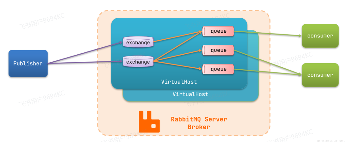 - queue:队列,存储消息。生产者投递的消息会暂存在消息队列中,等待消费者处理