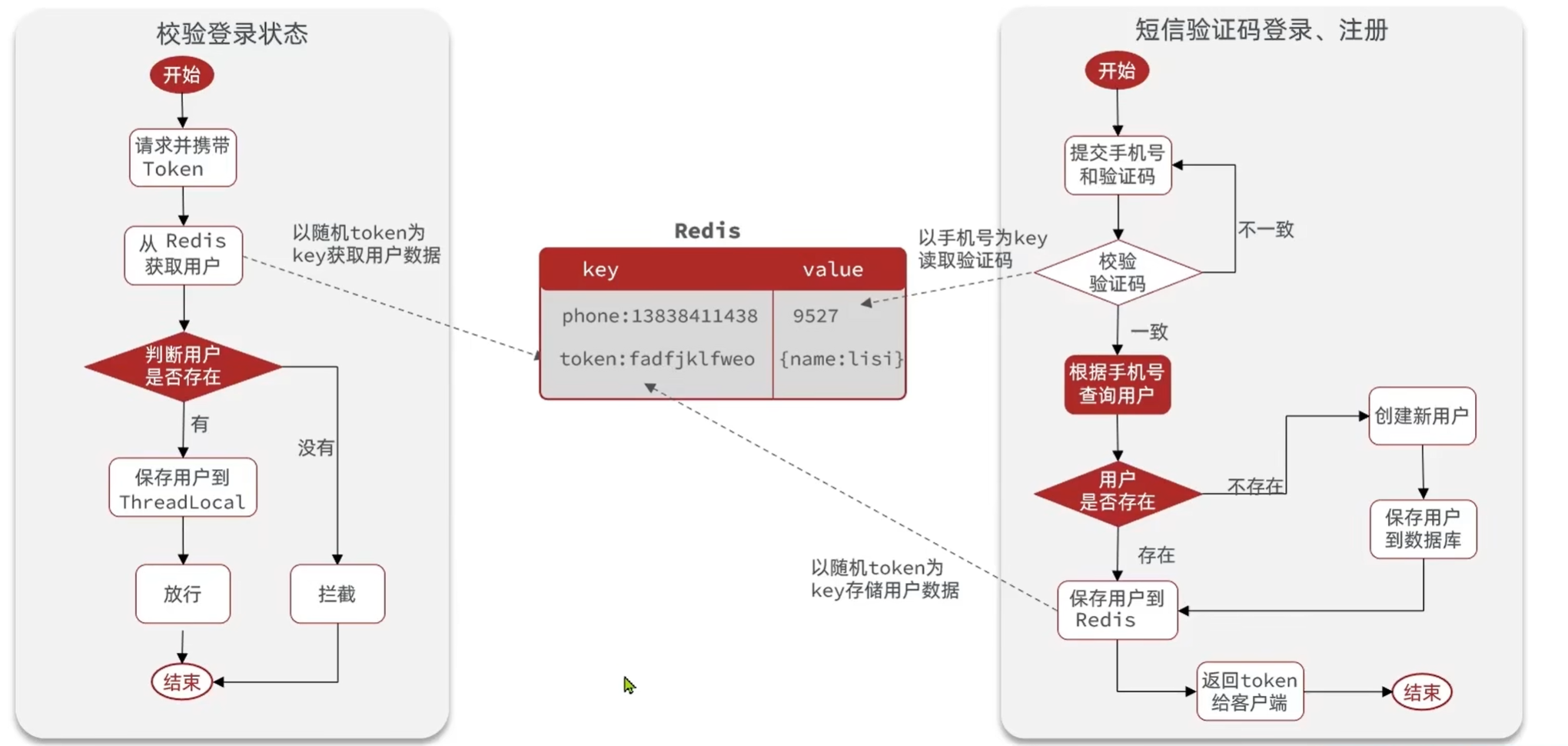 - 登录过程:根据手机号查询用户信息,不存在则新建,最后将用户数据保存到redis(作为值),并且生成token作为redis的key