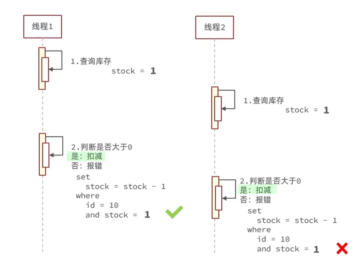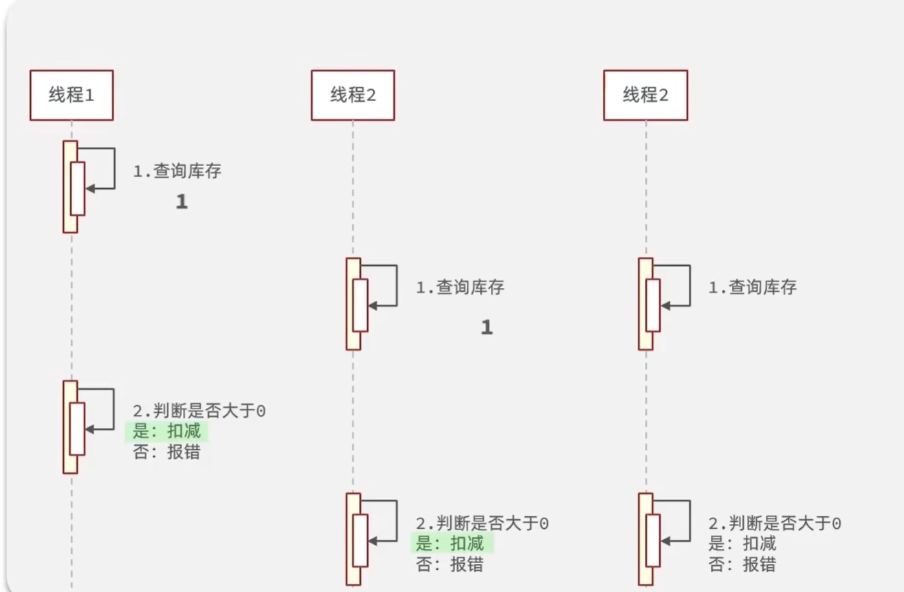 - 系统来不及“同步更新”库存,导致多个请求都成功了 ➜ 库存变负数