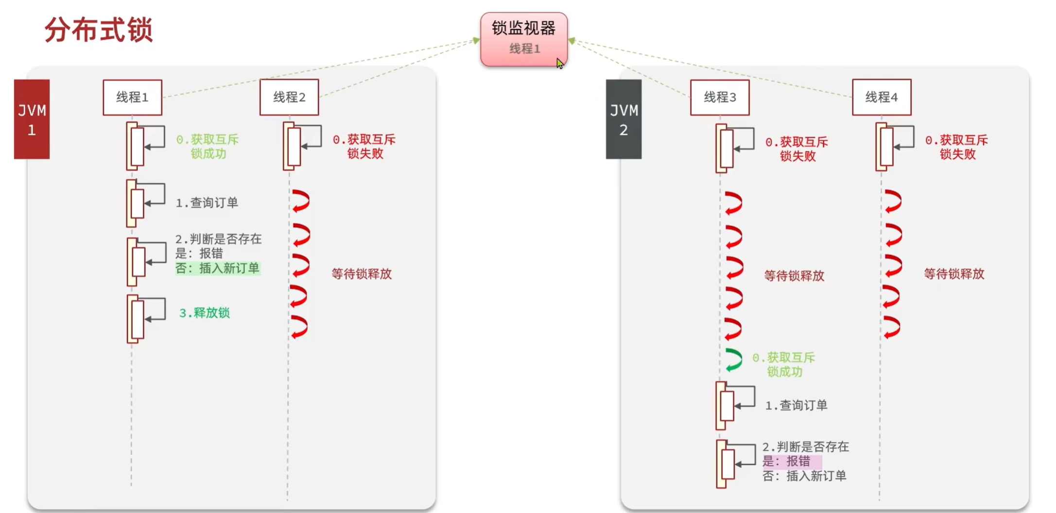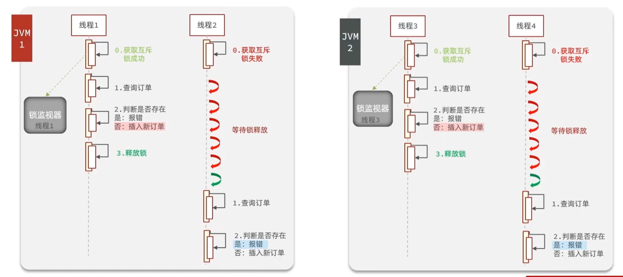 - 通过加锁可以解决在单机情况下的一人一单安全问题,但是在集群模式下就不行了