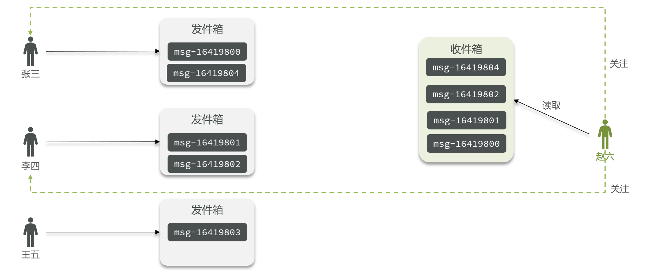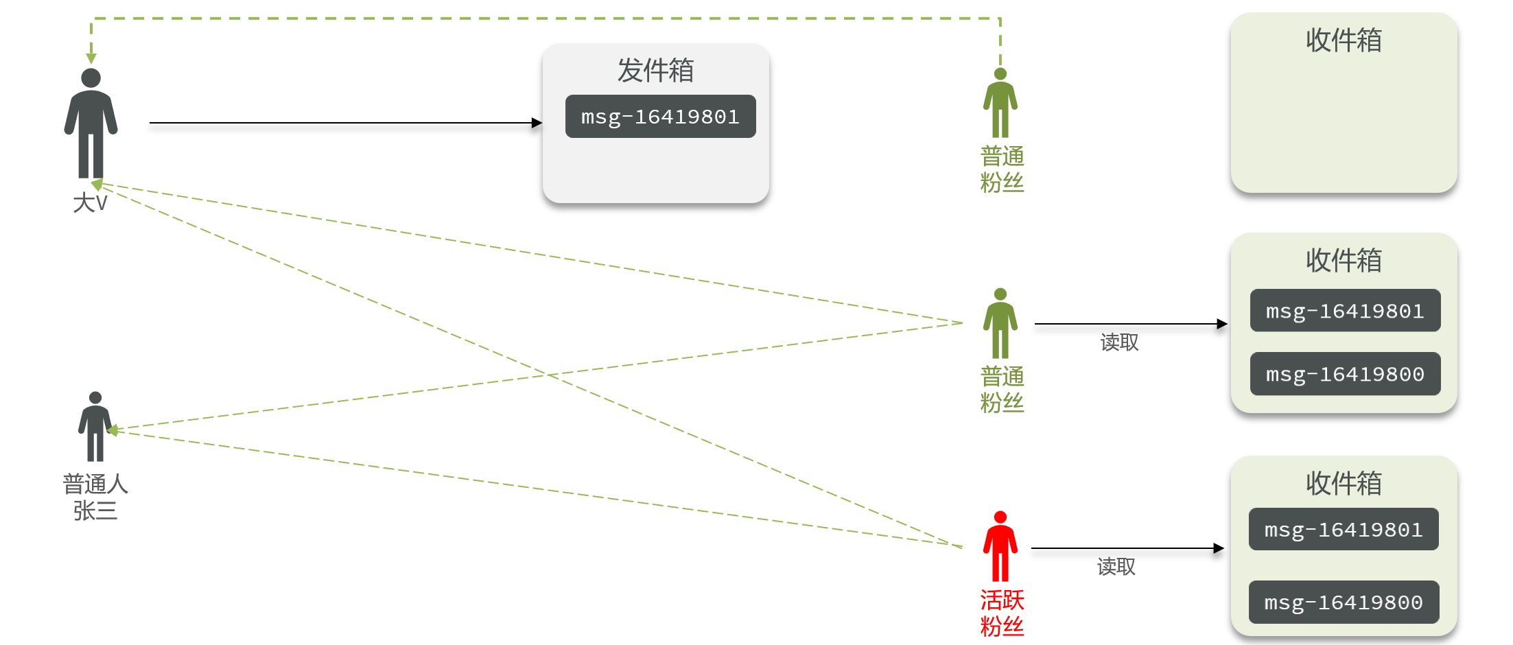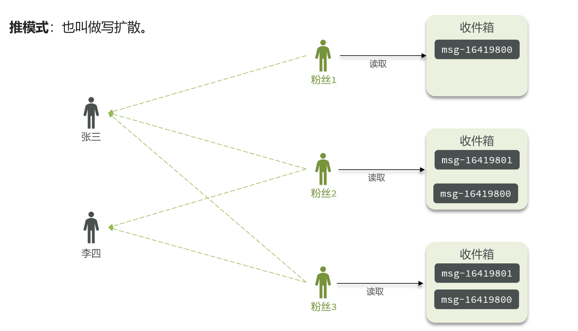 - 当张三写了一个内容,此时会主动的把张三写的内容发送到他的粉丝收件箱中去,假设此时李四再来读取,就不用再去临时拉取了(像朋友圈的方式)