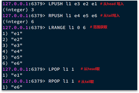 - LRANGE key star end:返回一段角标范围内的所有元素