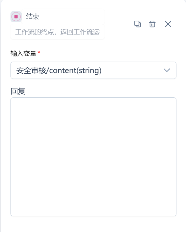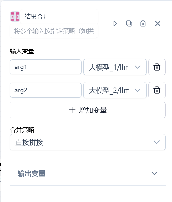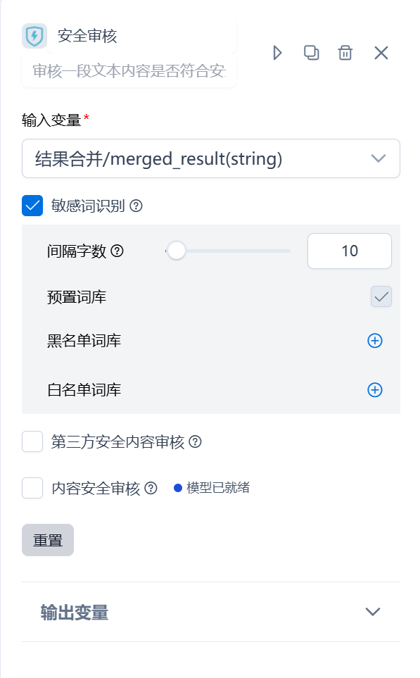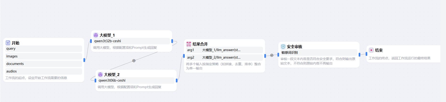 - 依次添加开始、大模型1、大模型2、结果合并、安全审核、结束节点,顺序连接即可